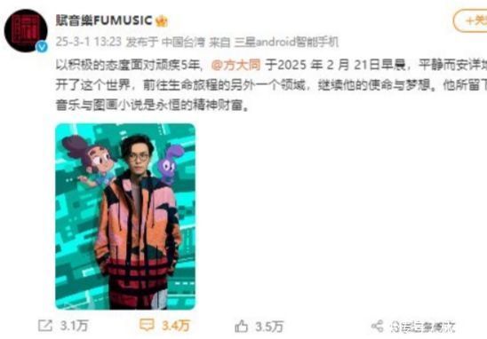 2025年3月1日,华语乐坛传来令人心碎的消息——41岁的音乐才子方大同因长期与疾病抗争,最终于2月21日清晨平静离世。其创立的音乐厂牌“赋音乐”发布讣告,称他“以积极的态度面对顽疾5年”,留下的音乐与绘本成为永恒的遗产。